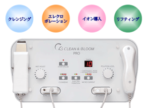 4つの機能(クレンジング・エレクトロポレーション・イオン導入・リフティング)を1台に搭載した最新美顔器で肌質に合わせた施術が可能です。注射を使わず、肌の深層まで高濃度の美容成分を大量に届けるイオン導入の20倍の導入効果があります。CLEAN&BLOOM PRO-Sは全て純チタンヘッドを採用し、人の肌にアレルギーを起こさない唯一の金属で、敏感肌や金属アレルギーの方にも安心です。
