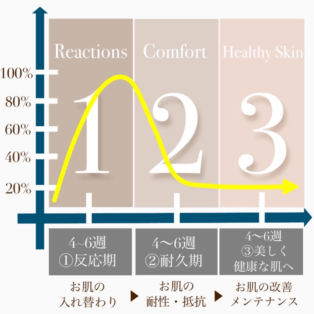 古い角質が剝奪し、ダメージを受けた肌の表層が剥がれ落ちるお肌の入れ替わりはじめです。この時期は下記のような反応が現れます。